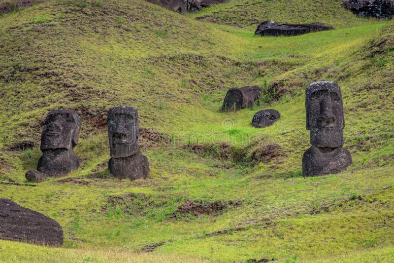 Acá en Rano Raraku, es donde los pascuenses empezamos a dar forma a los moai que tantos conocen. Es un volcán medio dormido, con una cantera gigante de piedra toba donde se tallaban casi todos los moai (95%). Lo bonito es que aún pueden verse muchos que quedaron ahí mismo sin terminar, como si su misión hubiese sido contarnos su historia.